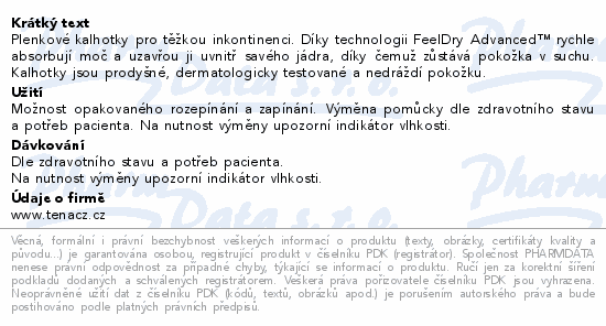 Plenkové kalhotky pro těžkou inkontinenci. Díky technologii FeelDry Advanced™ rychle absorbují moč a uzavřou ji uvnitř savého jádra, díky čemuž zůstává pokožka v suchu. Kalhotky jsou prodyšné, dermatologicky testované a nedráždí pokožku.