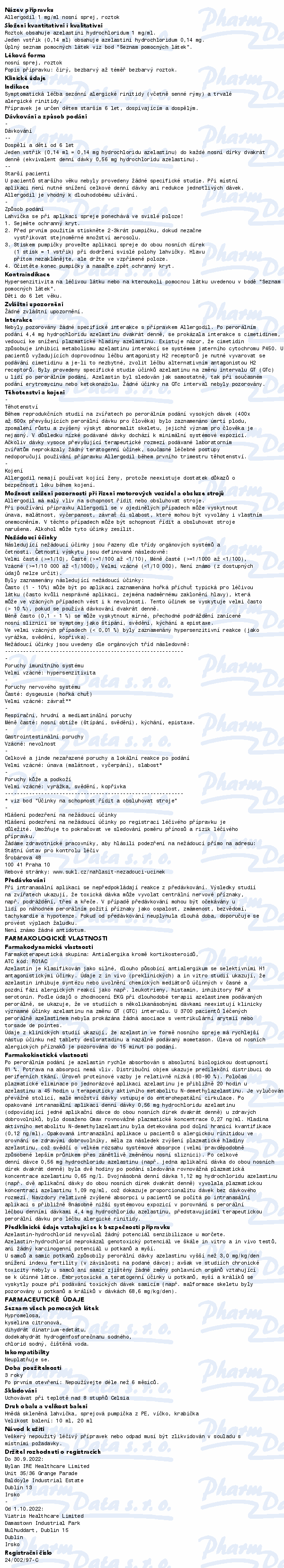 Allergodil, nosní sprej, je lék na alergii a používá se k léčbě nosních příznaků sezónní alergické rýmy (senné rýmy) a celoroční alergické rýmy. Allergodil je určen dětem starším 6 let, dospívajícím a dospělým. Čtěte podrobně příbalový leták.