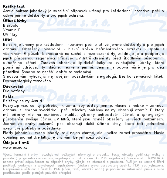Astrid balzám jahodový je speciální přípravek určený pro každodenní intenzívní péči o citlivé jemné dětské rty a pro jejich ochranu.