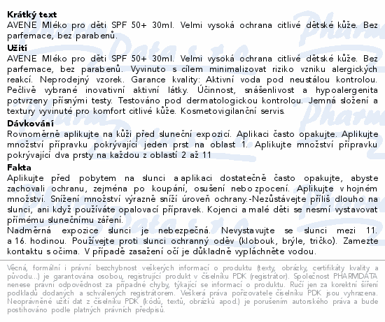 AVENE Mléko pro děti SPF 50+ 30ml. Velmi vysoká ochrana citlivé dětské kůže. Bez parfemace, bez parabenů.