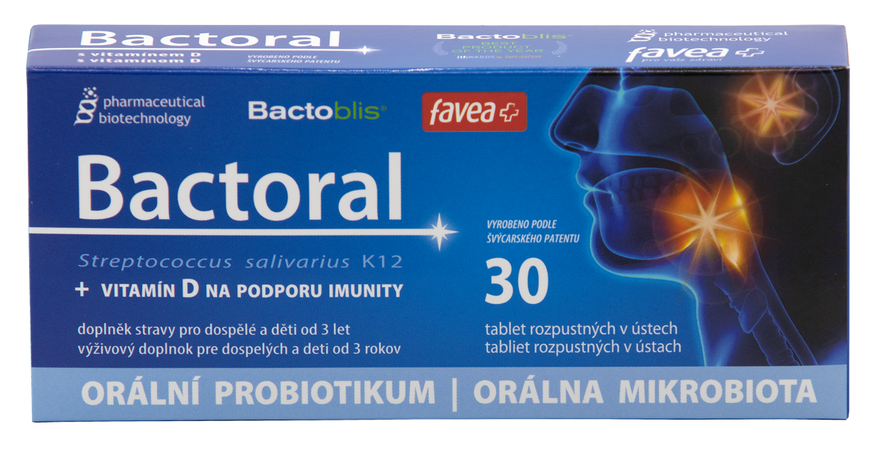 Kombinace orálního probiotika a vitaminu D pro zdravou imunitu. Přípravek Bactoral + vitamín D obsahuje probiotickou kulturu Streptococcus salivarius K12, která tvoří peptidy salivaricin A2 a salivaricin B tzv. bakteriociny. Tato probiotická bakterie po několika dnech užívání osídlí ústní dutinu, nosohltan a středouší a vytěsní patogenní bakterie. Probiotika jsou v přípravku vitaminem D, který je důležitý pro správnou funkci imunitního systému. Přípravek ve formě tablet rozpustných v ústech mohou užívat děti od 3 let a dospělí.