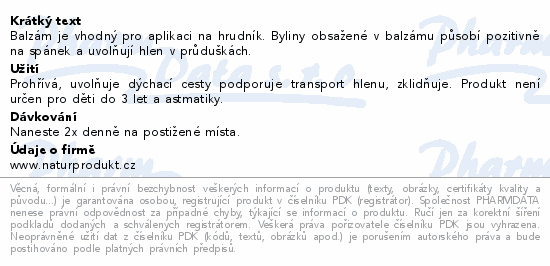 Balzám je vhodný pro aplikaci na hrudník. Byliny obsažené v balzámu působí pozitivně na spánek a uvolňují hlen v průduškách.