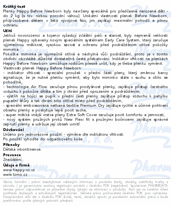 Plenky Happy Before Newborn byly navrženy speciálně pro předčasně narozené děti - do 2 kg (s tzv. nízkou porodní váhou). Unikátní vlastnosti plenek Before Newborn, přizpůsobené dětem v této vývojové fázi, jim zajišťují maximální pohodlí a plnou ochranu.
