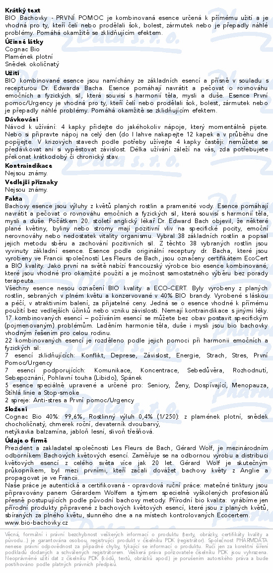 BIO Bachovky - PRVNÍ POMOC je kombinovaná esence určená k přímému užití a je vhodná pro ty, kteří čelí nebo prodělali šok, bolest, zármutek nebo je přepadly náhlé problémy. Pomáhá okamžitě se zklidňujícím efektem.