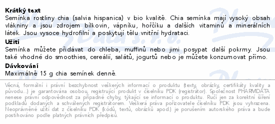 Semínka rostliny chia (salvia hispanica) v bio kvalitě. Chia semínka mají vysoký obsah vlákniny a jsou zdrojem bílkovin, vápníku, hořčíku a dalších vitaminů a minerálních látek. Jsou vysoce hydrofilní a poskytují tělu vnitřní hydrataci.