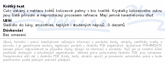 Cukr získaný z nektaru květů kokosové palmy v bio kvalitě. Krystalky kokosového cukru jsou čistě přírodní a neprocházejí procesem rafinace. Mají jemně karamelovou chuť.