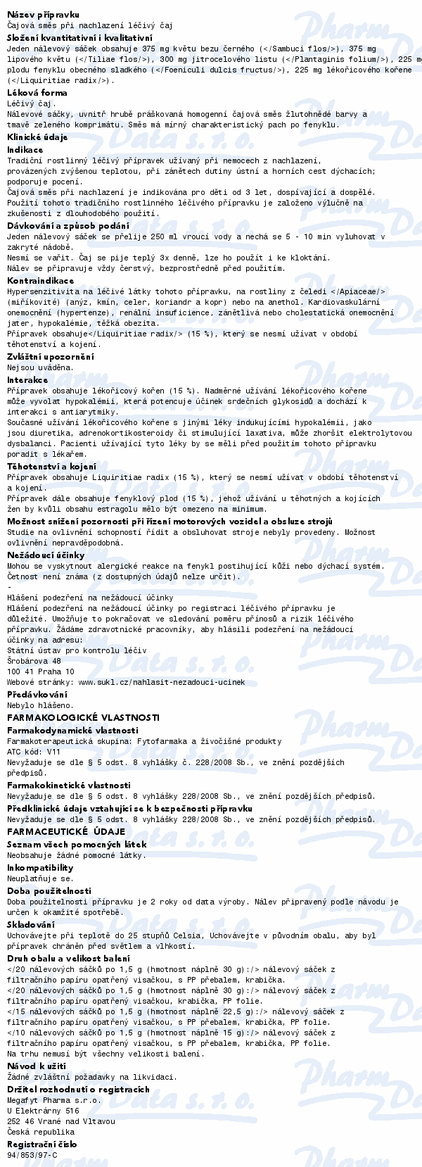 Tradiční rostlinný léčivý přípravek užívaný při nemocech z nachlazení, provázených zvýšenou teplotou, při zánětech dutiny ústní a horních cest dýchacích; podporuje pocení. Přípravek mohou užívat děti od 3 let, mladiství a dospělí. Čtěte pozorně příbalový leták.
