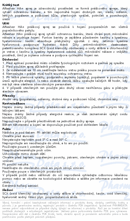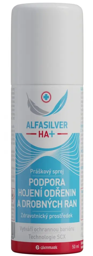 Alfasilver HA+ sprej je zdravotnický prostředek ve formě práškového spreje, který vytváří ochrannou bariéru, a tím napomáhá hojení drobných ran, vředů, odřenin, lehkých popálenin a poškození kůže, plenkových vyrážek, potniček a povrchových úrazů