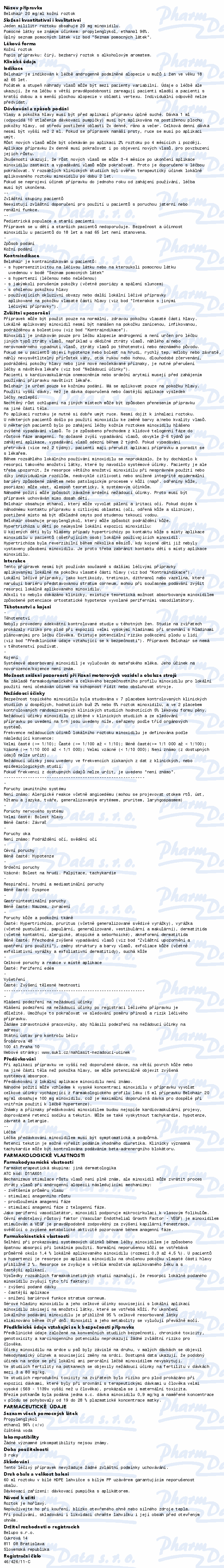 Belohair 20mg/ml kožní roztok je indikován k léčbě androgenně podmíněné alopecie u mužů i žen ve věku 18 až 65 let.