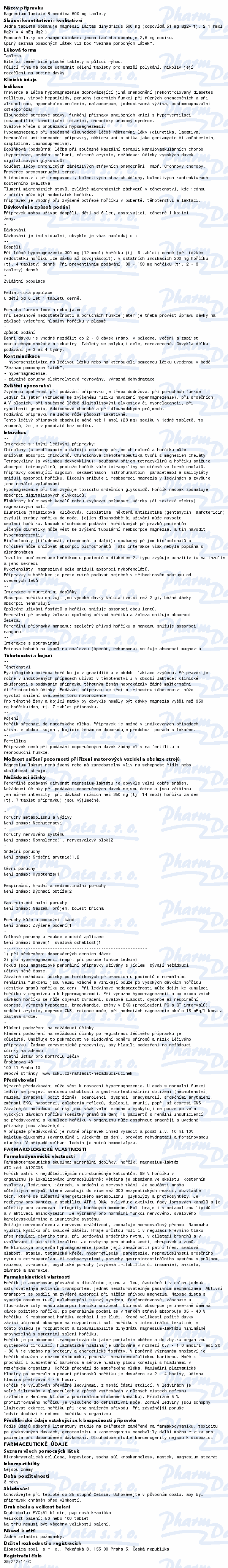 Přípravek Magnesium lactate Biomedica obsahuje hořčík, který patří k nejdůležitějším prvkům v lidském těle. Je nezbytný pro stavbu kostí, chrupavek a zubů a je významný pro normální funkci nervového, svalového, srdečně-cévního a imunitního systému. Čtěte pozorně příbalový leták.
