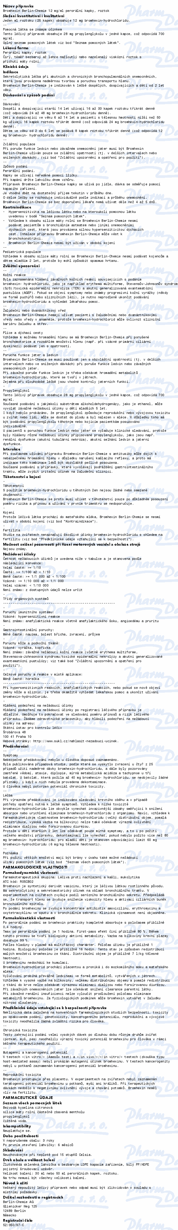 Přípravek se užívá k léčení všech onemocnění dýchacích cest, která jsou provázena tvorbou hustého, vazkého hlenu. Bromhexin mění složení hlenu, zkapalňuje ho a tím ulehčuje jeho vykašlávání. Účinek se projeví po 5 hodinách po požití. Čtěte pozorně příbalový leták.