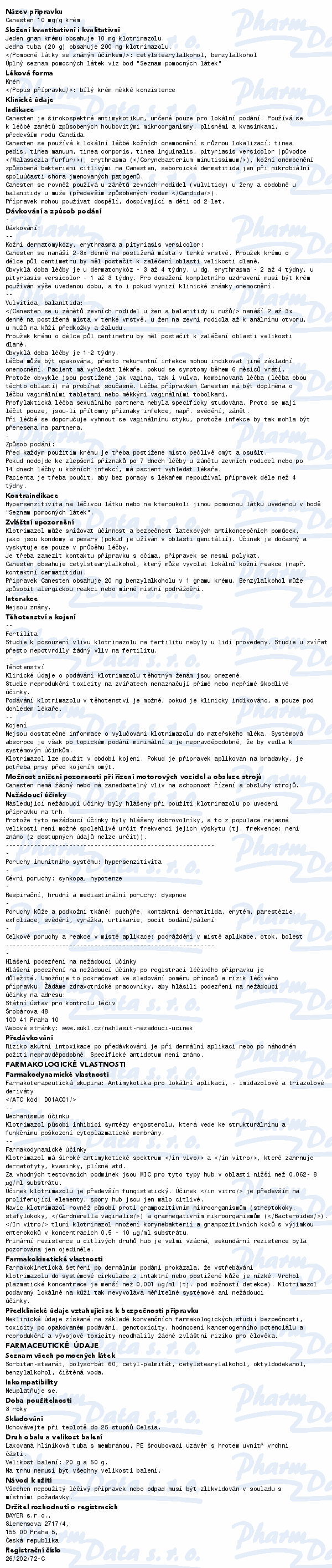 Canesten krém působí proti choroboplodným houbovitým mikroorganizmům, včetně dermatofytů, kvasinek a plísní i na některé druhy bakterií. Čtěte pozorně příbalový leták.