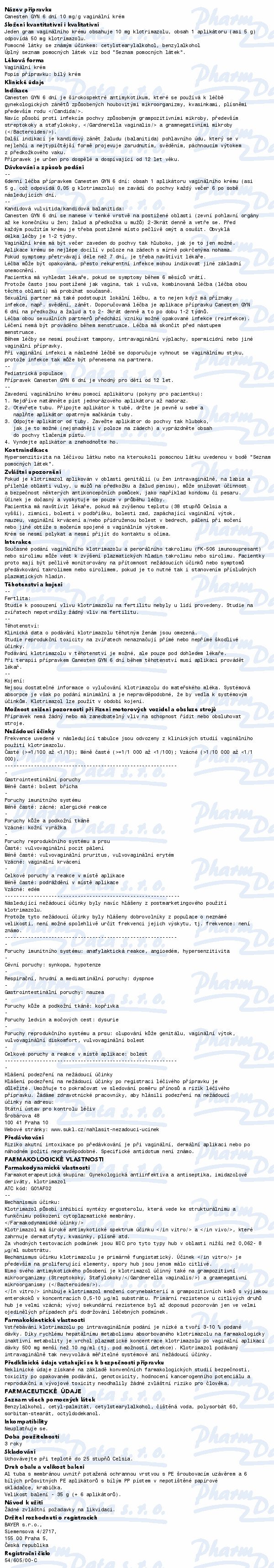 Canesten GYN 6 dní je širokospektré antimykotikum k léčbě vaginálních zánětů způsobených houbovitými mikroorganismy, kvasinkami, plísněmi (rod Candida) a některými druhy grampozitivních mikrobů ( streptokoky, stafylokoky) i gramnegativních mikrobů (bakteroides). Pro dospělé a děti od 12-ti let. Krém k vaginální aplikaci, aplikátory součástí balení. Další indikací je balanitis.