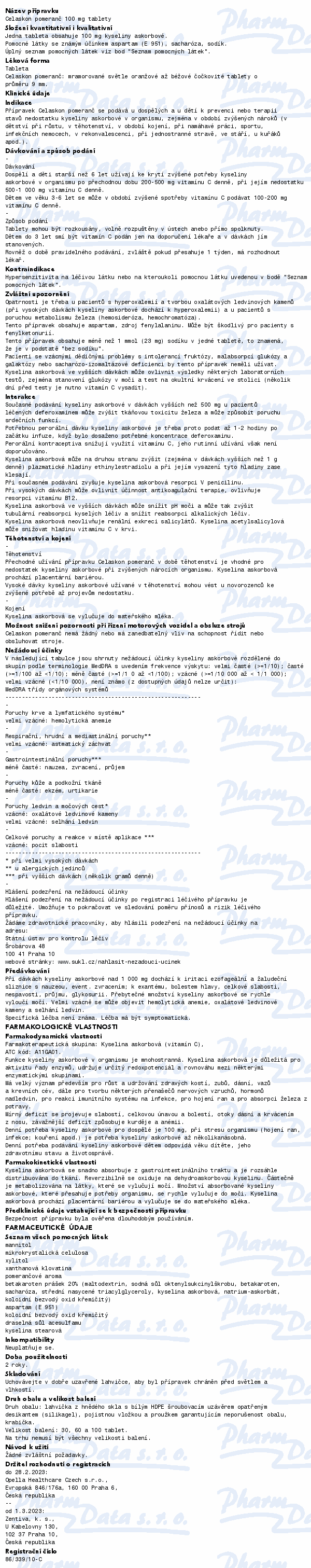Dětem ve věku 3-6 let podávají se v období zvýšené spotřeby vitamínu C 1–2 tablety přípravku Celaskon pomeranč denně.
