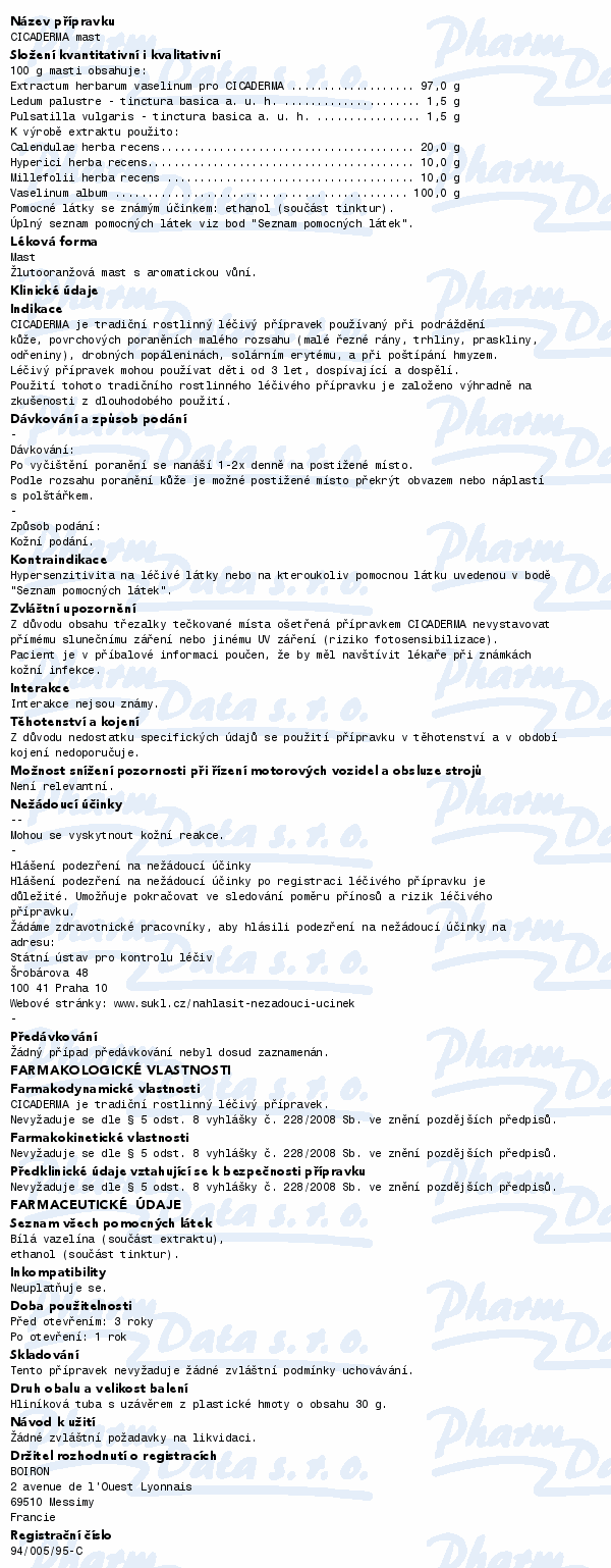 CICADERMA je tradiční rostlinný léčivý přípravek používaný při podráždění kůže, povrchových poraněních malého rozsahu (malé řezné rány, trhliny, praskliny, odřeniny), drobných popáleninách, solárním erytému, a při poštípání hmyzem. Čtěte pozorně příbalový leták.