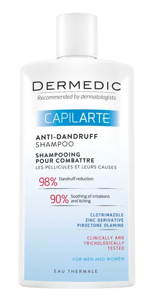 Jemně čistí vlasy a vlasovou pokožku a zmírňuje příznaky suchých i mastných lupů. Obsahuje trojkombinaci aktivních látek Clotrimazol, pyrithion zinku a piroktonový olamin, které působí proti tvorbě lupů. Šampon pomáhá normalizovat vylučování kožního mazu, obnovuje rovnováhu vlasové pokožky a mírní pocity svědění. Dermedic Capilarte šampon proti lupům je vhodný také pro poškozené a řídnoucí vlasy. Zvlhčuje a vyživuje vlasy a předchází jejich třepení. Glycerin a panthenol dávají vlasům lesk, vlasy jsou hladké a snadno se rozčesávají. Šampon byl klinicky a trichologicky testován. Hypoalergenní složení šamponu je vhodné pro citlivou vlasovou pokožku.