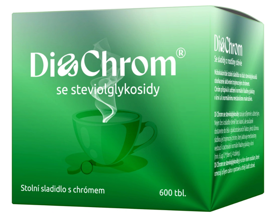 DiChrom se steviolglykosidy je inovativní nízkokalorické stolní sladidlo, které využívá přírodní sladivost steviolglykosidů získaných z listů rostliny Stevia rebaudiana Bertoni. Toto sladidlo je navíc obohaceno o glukózotoleranční faktor s trojmocným chrómem, který přispívá k udržení normální hladiny glukózy v krvi a podporuje správný metabolismus makroživin. Díky své sladivosti, která odpovídá jedné velké kostce cukru (4,4 g) na tabletu, ale s o 95,9 % nižší kalorickou hodnotou, je DiChrom ideální pro osoby, které chtějí sladit zdravě a omezit příjem cukru.