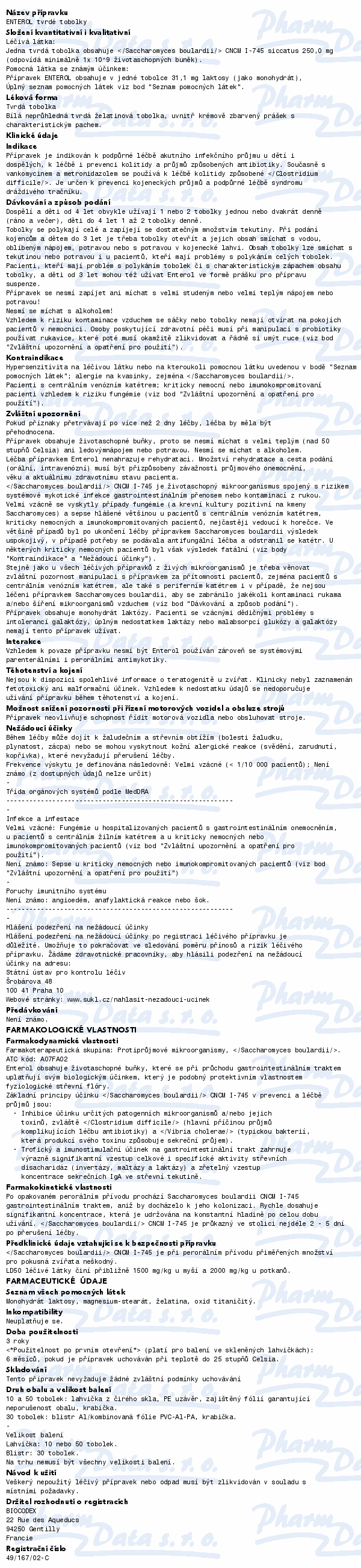 Enterol obsahuje jako léčivou látku mikroorganismus Saccharomyces boulardi, který vyrovnává přirozené mikrobiální prostředí střeva. Přípravek Enterol je určen jako podpůrná léčba akutního infekčního průjmu. Dále se používá k léčbě a prevenci zánětu tlustého střeva provázeného průjmy v souvislosti s užíváním antibiotik. Enterol tvrdé tobolky mohou užívat dospělí, dospívající a děti včetně kojenců. Děti do 4 let pouze na doporučení lékaře.