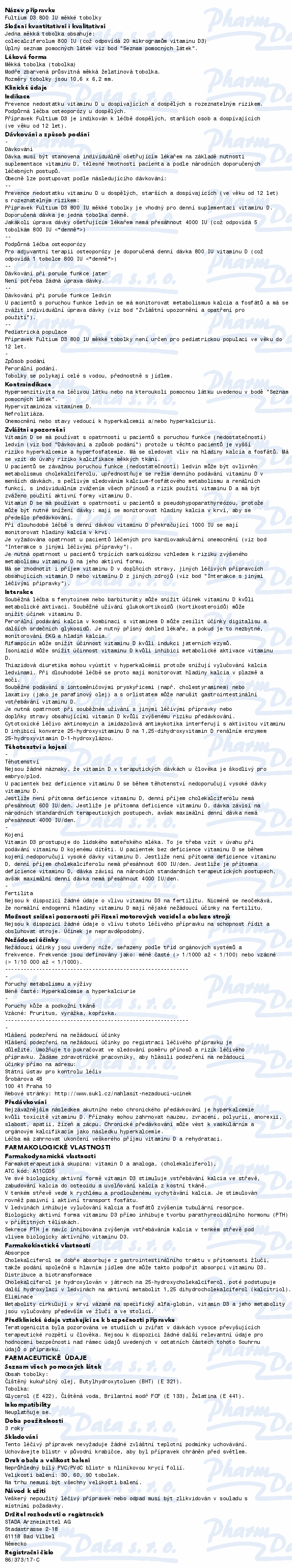 Fultium D3 obsahuje léčivou látku cholekalciferol (vitamin D3). Vitamin D3 reguluje vstřebávání a metabolismus vápníku a také ukládání vápníku do kostní tkáně. Čtěte pozorně příbalový leták.