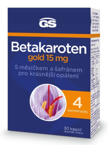 GS Betakaroten gold 15 mg je novinka pro krásu pokožky vyvinutá na základě nejnovějších poznatků dermatologie. Obsahuje silnou dávku beta-karotenu + šafrán a měsíček lékařský, které vdechnou vaší pleti zlatavý tón i bez intenzivního opalování. Beta-karoten je oranžové barvivo, karotenoid, který se v lidském těle přetváří na vitamin A, důležitý k udržení zdraví pokožky, sliznic i zraku. Přírodním zlatem pro pokožku je šafrán: obsahuje totiž dva typy karotenoidů, krocin a krocetin, jež díky svým pigmentačním schopnostem, přispívají i k žádoucímu zabarvení pokožky. Měsíček je zdrojem dalších přírodních karotenoidů – luteinu a zeaxantinu.