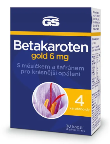 GS Betakaroten gold 6 mg je novinka pro krásu pokožky vyvinutá na základě nejnovějších poznatků dermatologie. Obsahuje kombinaci beta-karotenu, šafránu a měsíčku lékařského, která vdechne vaší pleti zlatavý tón i bez intenzivního opalování. Beta-karoten je oranžové barvivo, karotenoid, který se v lidském těle přetváří na vitamin A, důležitý k udržení zdraví pokožky, sliznic i zraku. Přírodním zlatem pro pokožku je šafrán: obsahuje totiž dva typy silných karotenoidů, krocin a krocetin, jež díky svým pigmentačním schopnostem, přispívají i k žádoucímu zabarvení pokožky. Měsíček je zdrojem dalších přírodních karotenoidů – luteinu a zeaxantinu.