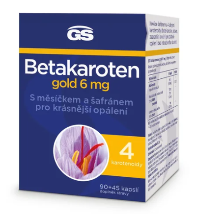 GS Betakaroten gold 6 mg je novinka pro krásu pokožky vyvinutá na základě nejnovějších poznatků dermatologie. Obsahuje kombinaci beta-karotenu, šafránu a měsíčku lékařského, která vdechne vaší pleti zlatavý tón i bez intenzivního opalování. Beta-karoten je oranžové barvivo, karotenoid, který se v lidském těle přetváří na vitamin A, důležitý k udržení zdraví pokožky, sliznic i zraku. Přírodním zlatem pro pokožku je šafrán: obsahuje totiž dva typy silných karotenoidů, krocin a krocetin, jež díky svým pigmentačním schopnostem, přispívají i k žádoucímu zabarvení pokožky. Měsíček je zdrojem dalších přírodních karotenoidů – luteinu a zeaxantinu.