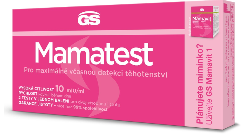 Jednorázový těhotenský test GS Mamatest je určen ke včasné detekci těhotenství v domácím prostředí. GS Mamtest zjišťuje přítomnost lidského choriového gonadotropinu (hCG), který se objevuje v moči již ve velmi časném období těhotenství. Test se provádí ponořením absorbujícího konce proužku do nádobky s močí. Můžete se testovat již první den vynechání pravidelné menstruace a test můžete provádět kdykoliv během dne. Nejvhodnější však je první ranní moč, která v případě těhotenství obsahuje nejvíce těhotenského hormonu.
