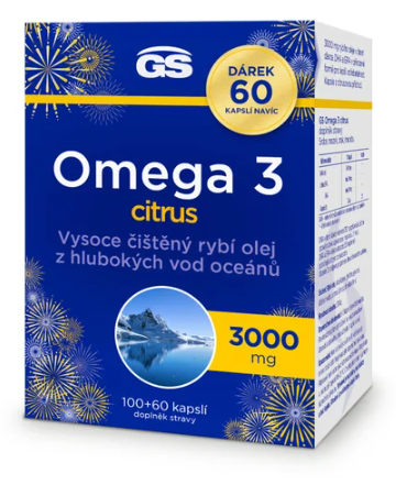 Vyvážená kombinace nejdůležitějších nenasycených mastných kyselin EPA a DHA pro podporu zdravého srdce i správné činnosti mozku. GS Omega 3 Citrus obsahuje 3 000 mg vysoce čištěného rybího oleje v denní dávce, bohatého na omega-3 kyseliny v přirozené formě triglyceridů, která je pro organismus až o 50 % lépe využitelná než často používané polosyntetické ethylestery. DHA a EPA v denní dávce 250 mg přispívají ke správné činnosti srdce. DHA navíc v dávce 250 mg podporuje správnou činnost mozku a zdravý zrak. Přípravek je obohacen o vitamin D3 pro podporu imunity, zdravých kostí a zubů. To vše v kapsli s citrusovým aroma.