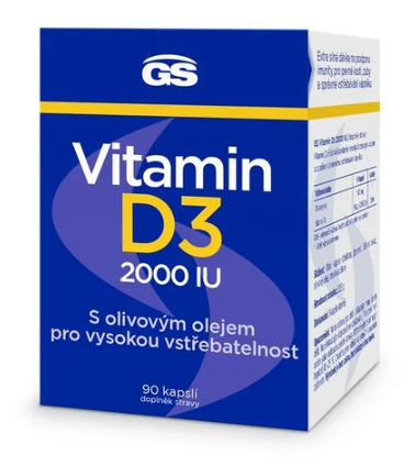 GS Vitamin D3 2000 IU je doplněk stravy s vysokým obsahem tohoto vitaminu, který je klíčový pro imunitní systém, správnou funkci svalů a zdravé kosti. Tělo si může část vitaminu D vyrobit samo při vystavení slunečnímu záření, avšak v našich podmínkách to často není dostatečné, a proto je důležité přijímat ho i ze stravy. Vitamin D je látka rozpustná v tucích, a proto jsou kapsle doplněny olivovým olejem, který umožňuje organismu využít vitamin D efektivněji.