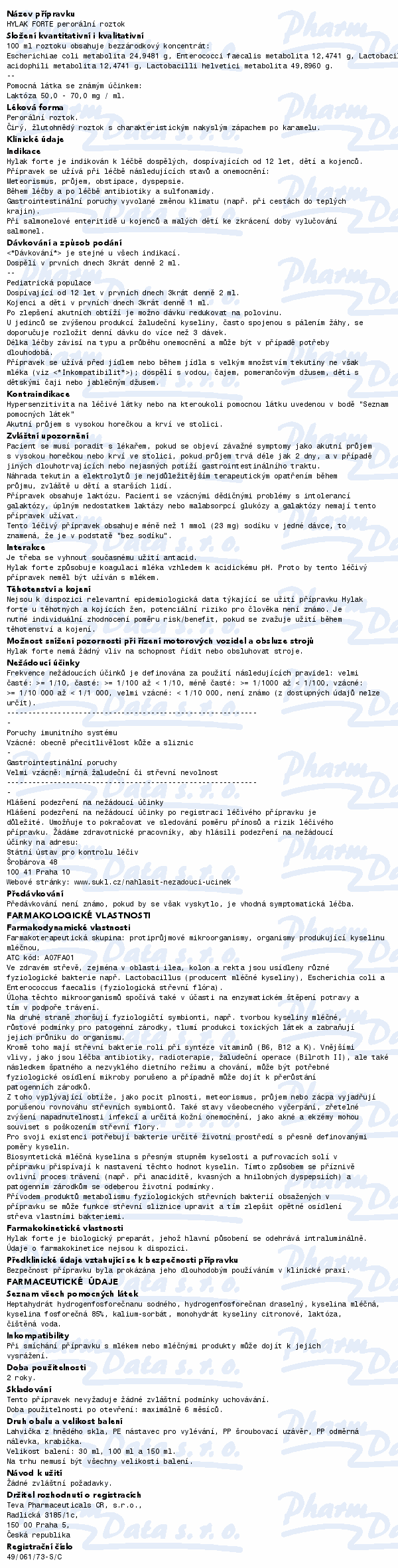 Užíváním přípravku Hylak forte je přirozenou cestou podpořen růst tělu prospěšných bakterií, úprava pH a tím i normální činnosti trávicího ústrojí. Užívá se při nadýmání, průjmu nebo zácpě, poruchách trávení, při trávicích obtížích. Čtěte pozorně příbalový leták.