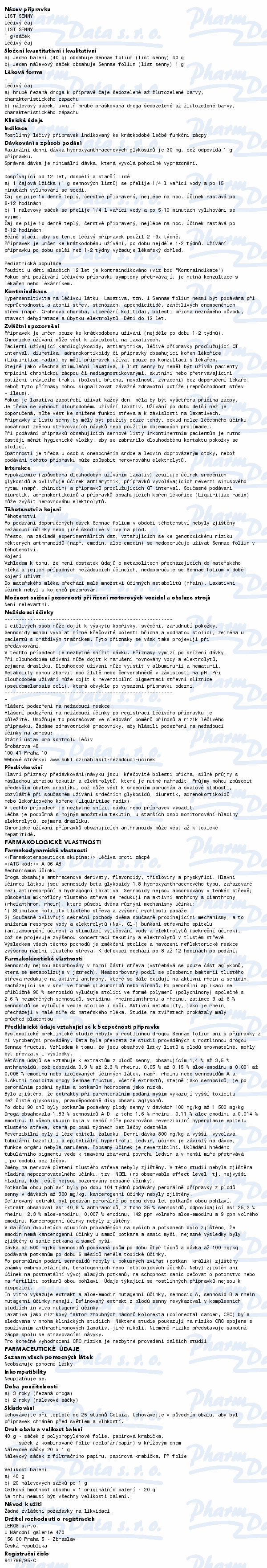 Leros Senna list rostlinné projímadlo. Přípravek se užívá jako krátkodobá léčba funkční zácpy, k akutnímu vyprázdnění střev před vyšetřením. Čtěte pozorně příbalový leták.