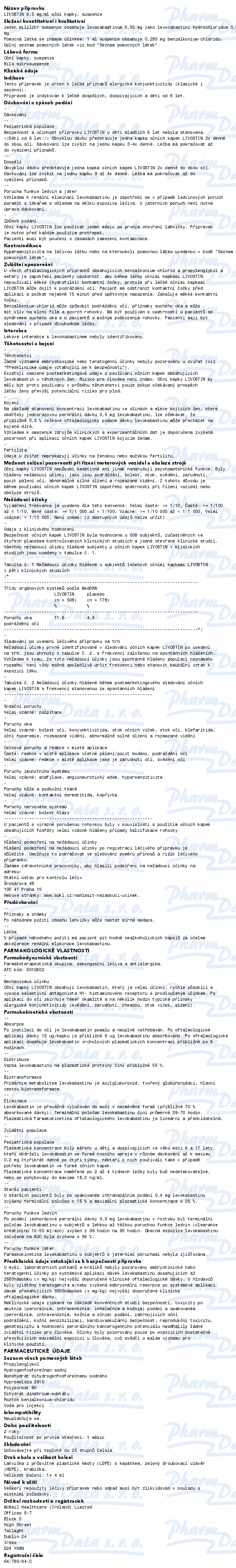 Děti od 6 let: Obvyklou dávku představuje jedna kapka očních kapek LIVOSTIN 2x denně do obou očí. Dávkování lze zvýšit na jednu kapku 3-4x denně. Léčba má pokračovat až do vymizení příznaků.