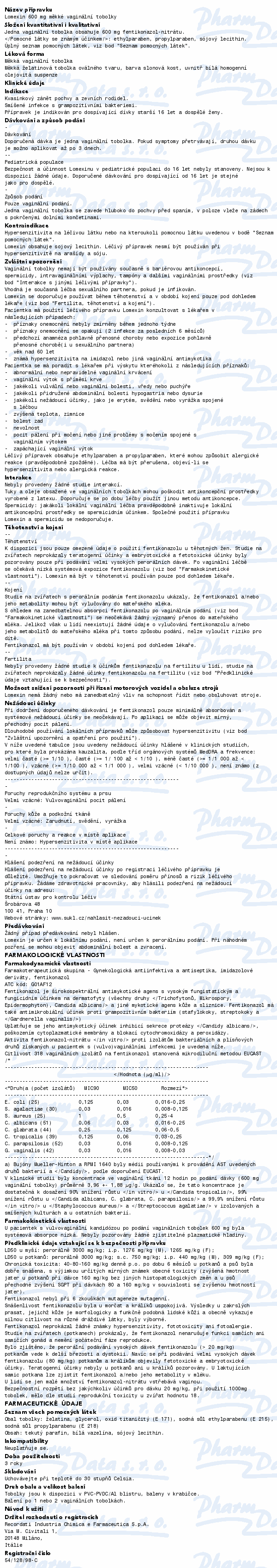 Přípravek Lomexin® 600 mg, s obsahem léčivé látky fentikonazol-nitrát, je antimykotikum (léčivý přípravek k léčbě plísňových onemocnění) účinné proti kvasinkovým mikroorganismům, zejména rodu Candida, které způsobují infekce pochvy.