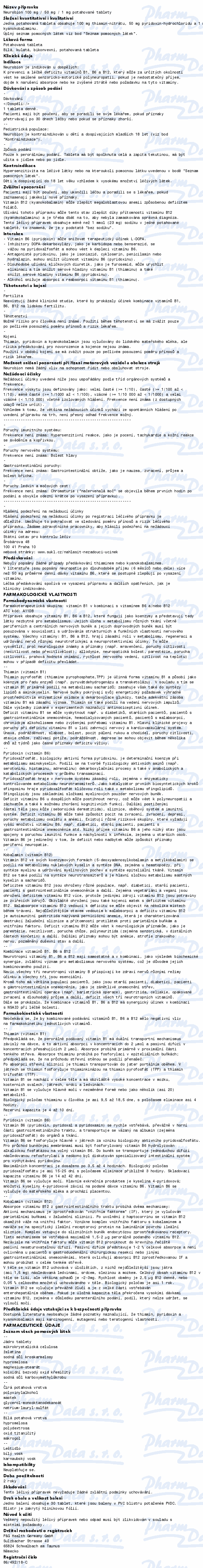 Léčivými látkami jsou thiamini nitras 100 mg, pyridoxini hydrochloridum 50 mg a cyancobalaminum 1 mg v jedné potahované tabletě.