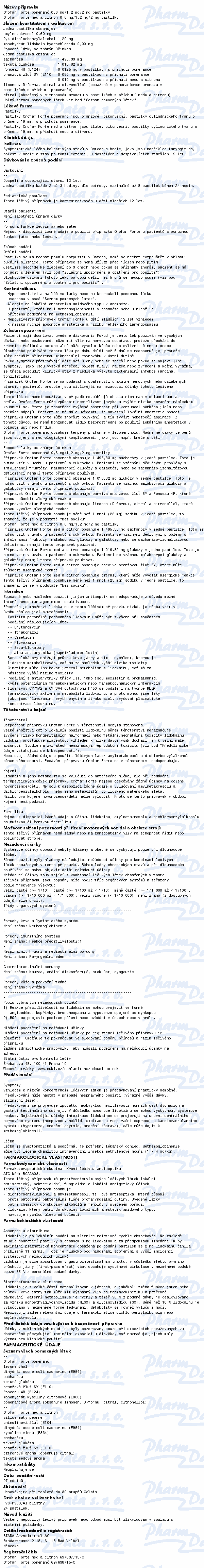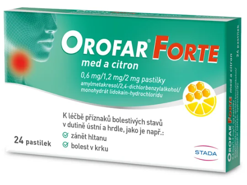 Orofar Forte med a citron léčí zánět v dutině ústní a hltanu. Obsahuje antiseptické složky amylmetakresol a 2,4-dichlorbenzylalkohol a také anestetickou složku lidokain. Díky lidokainu rychle ulevuje od bolesti v krku a dutině ústní. Na doporučení lékaře se přípravek může používat při bolesti v krku po odstranění krčních mandlí.