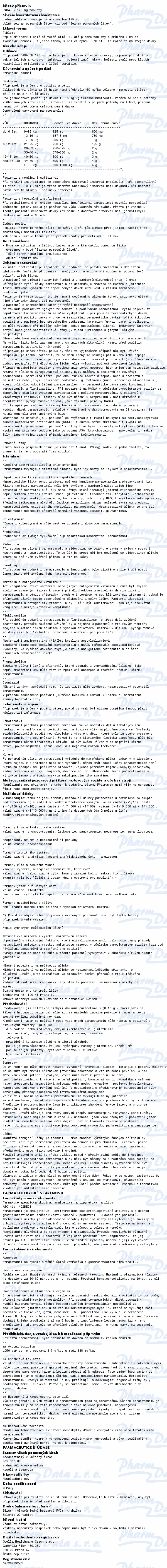 Paracetamol, léčivá látka přípravku PARALEN 125 tablety, působí proti bolesti a snižuje zvýšenou tělesnou teplotu. Tablety PARALEN 125 se podávají dětem ke snížení horečky a bolesti při chřipce, nachlazení a jiných infekčních onemocněních dětského věku. Čtěte pozorně příbalový leták.