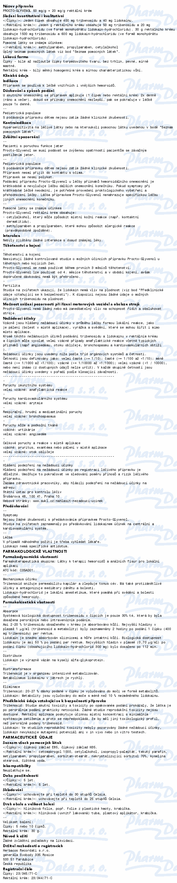 Procto-Glyvenol se používá pro místní léčbu vnějších a vnitřních hemeroidů. První léčivá látka, tribenosid působí místně na příčiny zánětu. Druhá léčivá látka, lidokain je místní anestetikum, které poskytuje okamžitou úlevu od svědění, píchání a bolesti. Čtěte podrobně příbalový leták.
