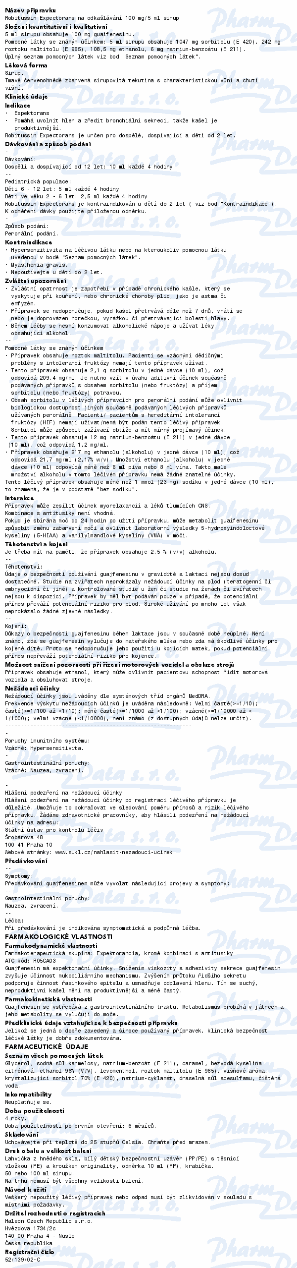 Přípravek Robitussin Expectorans obsahuje léčivou látku guajfenesin. Je to lék na odkašlávání, který pomáhá uvolnit hlen a zředit výměšky v průduškách, takže kašel je produktivnější a dojde k uvolnění nahromaděného hlenu v horních dýchacích cestách. Přípravek je určen pro dospělé, dospívající a děti od 2 let.