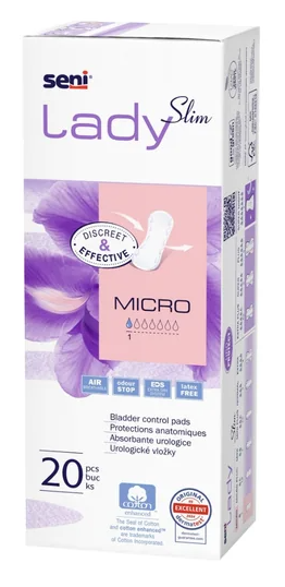 Prodyšné inkontinenční vložky Seni Lady Slim Micro se savostí 60 ml. Nejmenší velikost vložky s nejnižší savostí v řadě Seni Lady Slim. Vrchní netkaná textilie s 15 % bavlny potvrzená ochrannou známkou Cotton Enhanced.