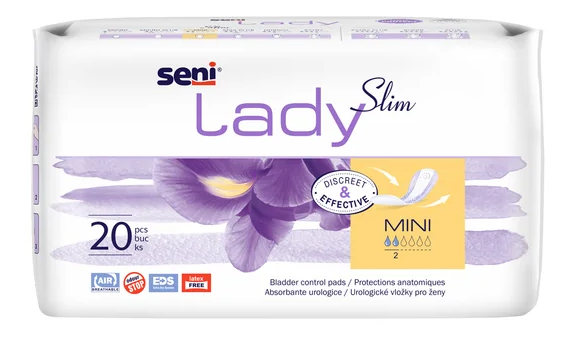 Inkontinenční prodyšná vložka Seni Lady Slim Mini o savosti 200 ml pro ženy s lehkým únikem moči preferující aktivní životní styl a oceňující komfort a bezpečí spolu s naprostou diskrétností. Urologická vložka o velikosti 9,5x20,5cm.