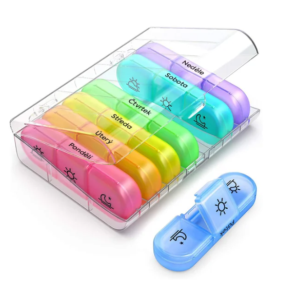 - 3 přihrádky na každý den: ráno, poledne, večer