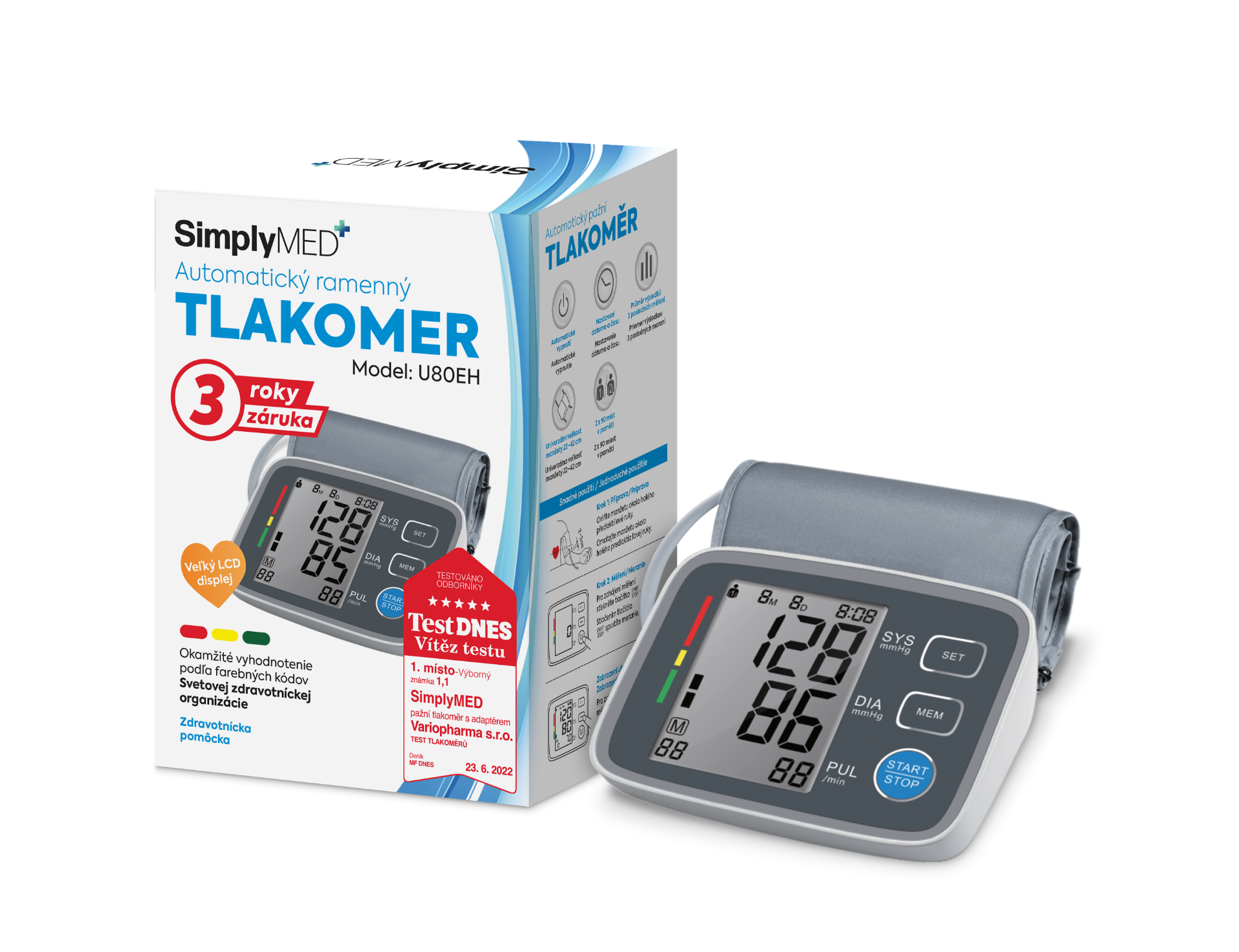 Automatický pažní digitální tlakoměr Simplymed U80EH. Spolehlivý, Profesionální, Velký displej LCD, Paměť 2x90 výsledků.