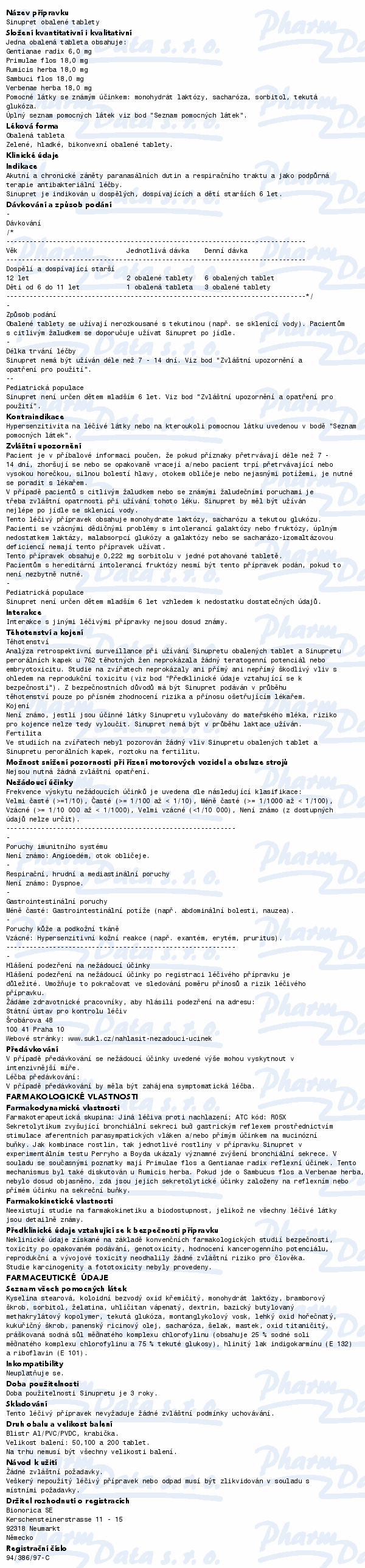 Sinupret se užívá při akutních a chronických zánětech vedlejších dutin nosních a dýchacích cest a jako podpůrná léčba při antibiotické léčbě. Sinupret působí sekretolyticky tím, že zvyšuje tvorbu, rozpouštění a vykašlávání hlenů z dýchacích cest. Čtěte pozorně příbalový leták.