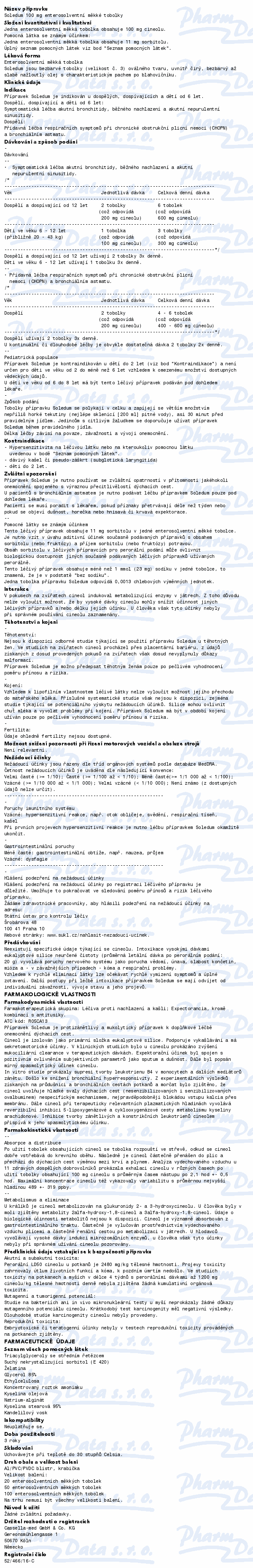 Určeno pro dospívající a děti od 6 let k léčbě příznaků akutní bronchitidy a běžného nachlazení. Od 12 let k léčbě příznaků akutní nehnisavé sinusitidy, přídavné léčbě dýchacích obtíží při CHOPN a průduškovém astmatu - pouze po poradě s lékařem. Čtěte podrobně příbalový leták.
