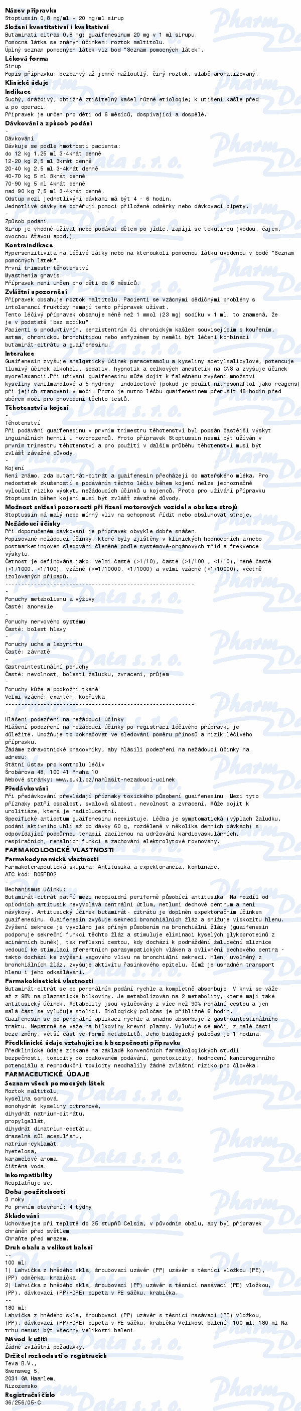 Léčivými látkami jsou butamirati citras 0,08 g; guaifenesinum 2,0 g ve 100 ml sirupu. - Pomocnými látkami jsou roztok maltitolu, kyselina sorbová, monohydrát kyseliny citronové, dihydrát natrium-citrátu, propyl-gallát, dihydrát dinatrium-edetátu, draselná sůl acesulfamu, natrium-cyklamát, hyetelosa, karamelové aroma a čištěná voda.