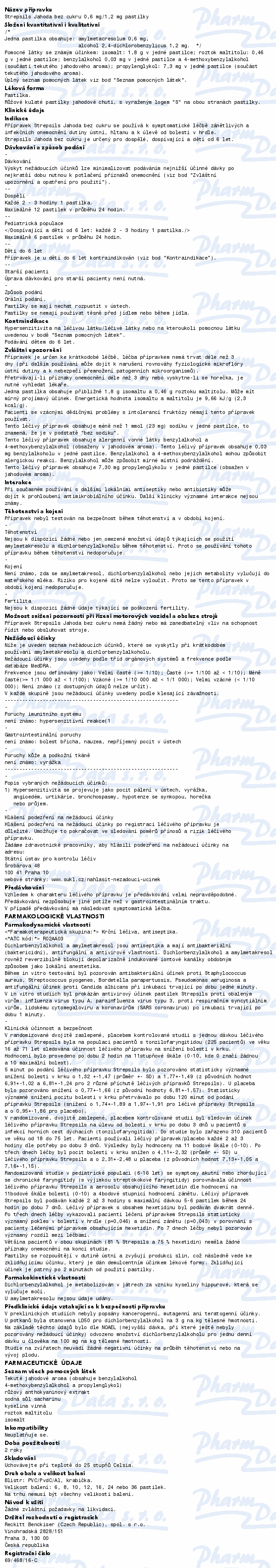 Léčivé látky v 1 pastilce: amylmetacresolum 0,6 mg, alcohol 2,4-dichlorobenzylicus 1,2 mg. Pomocné látky: tekuté jahodové aroma (obsahuje benzylalkohol a propylenglykol), růžový anthokyaninový extrakt, sodná sůl sacharinu, kyselina vinná, roztok maltitolu, isomalt.