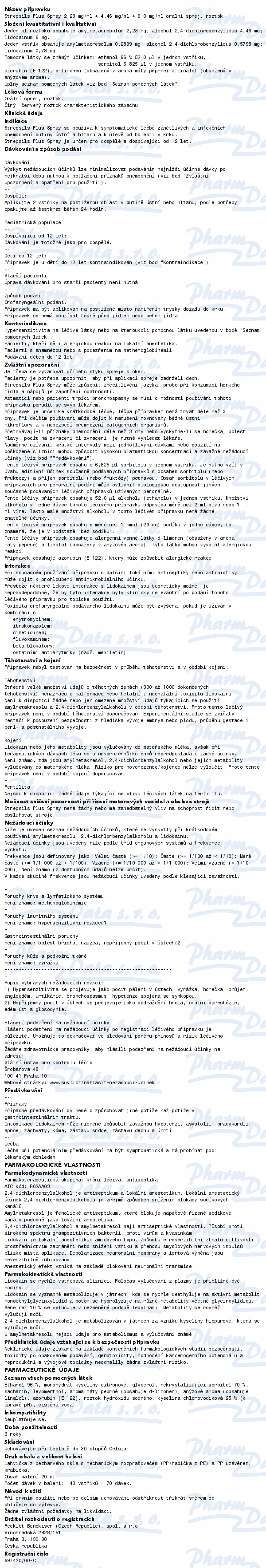Strepsils Plus Spray je kombinovaný přípravek. Obsahuje dichlorbenzenmethanol a amylmetakresol, které mají antiseptické účinky a ničí bakterie, viry a kvasinky, způsobující bolesti v krku a záněty dutiny ústní. Lidokain je anestetikum, které mírní bolest místním tlumivým působením na nervová zakončení ve tkáních.