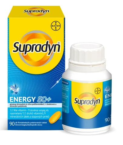 Supradyn ENERGY 50+ potahované tablety s obsahem multivitaminů a minerálních látek, s extraktem ženšenu a olivovými polyfenoly.