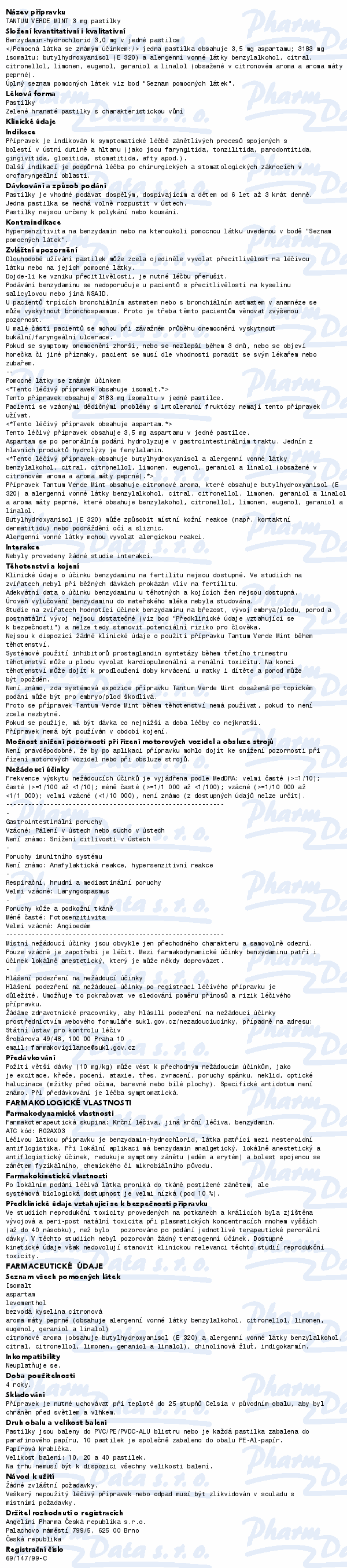 Léčivá látka: Benzydamini hydrochloridum, 3 mg v 1 pastilce. Pomocné látky: Isomalt, aspartam, levomenthol, kyselina citronová, citronové aroma, aroma máty peprné, chinolínová žluť, indigokarmín.