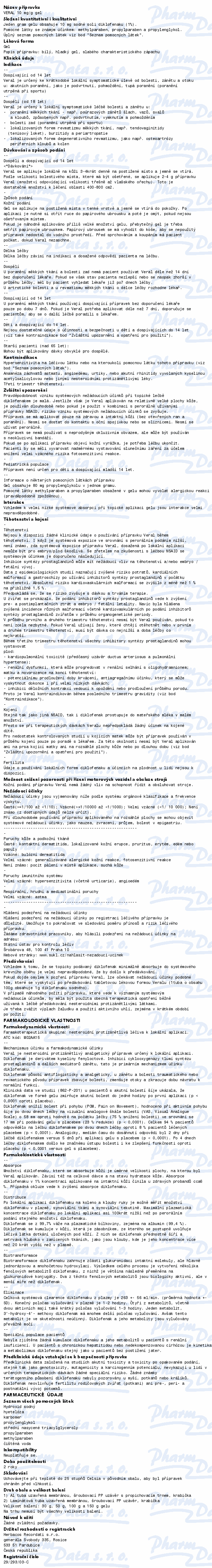VERAL 10mg/g gel se používá k místní léčbě onemocnění pohybového aparátu poúrazového, zánětlivého nebo degenerativního původu, tj. k odstranění bolesti a zánětu svalů, kloubů a měkkých tkání v okolí kloubů. Čtěte pozorně příbalový leták.